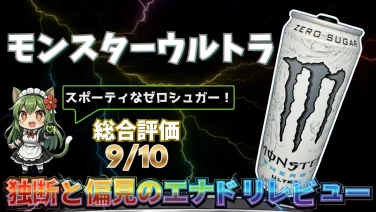 定番エナドリ「モンスター ウルトラ」を平方野雪が実飲レビュー。爽やかなシトラス系の味わいとゼロシュガーらしからぬ飲みやすさ、ゼロカロリー・糖類0g・カフェイン約142mgの設計、白基調の缶デザインや人工甘味料感も解説。