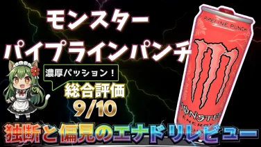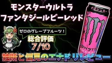 新作エナドリ「モンスター ウルトラファンタジールビーレッド」を平方野雪が実飲レビュー。ピンクグレープフルーツ風味の強めの酸味や後に残る人工甘味料感、ゼロカロリー・糖類0g・カフェイン約142mgの設計、華やかな缶デザインも解説。